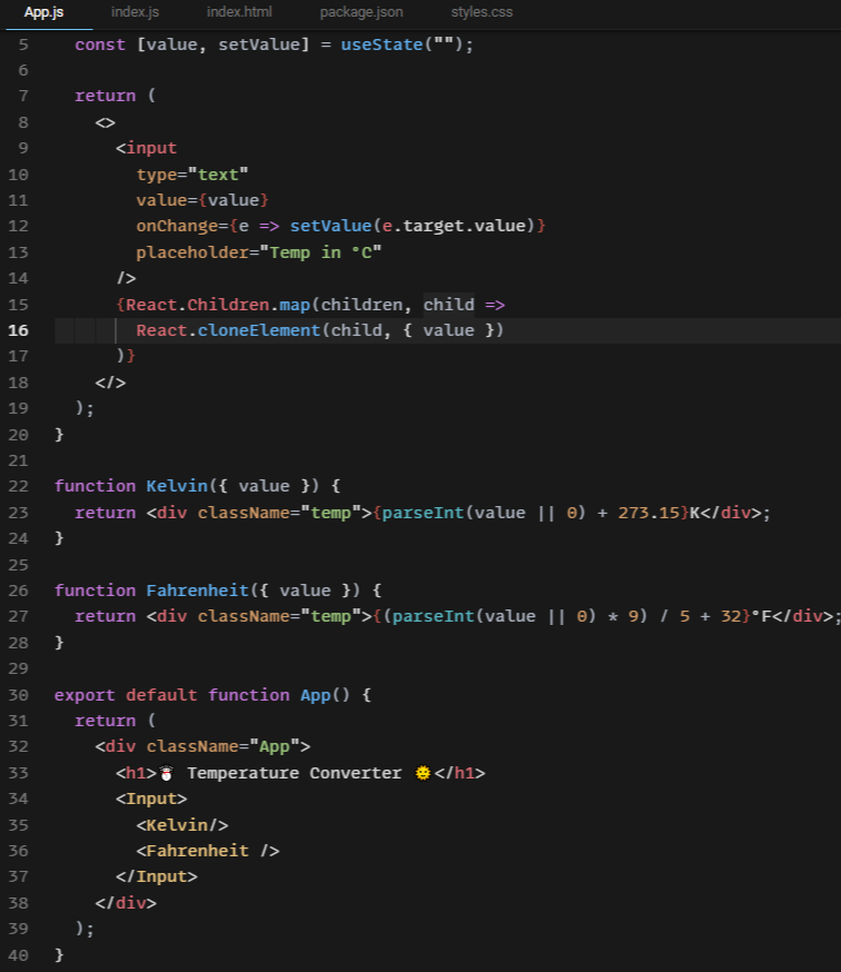 위 코드를 보면 props.render(value)처럼 Render Prop의 인자로 value(온도)를 넘겨 Kelvin, Fahrenheit 컴포넌트에서 공통으로 value를 사용하고 있습니다. 만약 Render Prop을 사용하지 않고 Children Prop을 사용했다면 어떨까요?