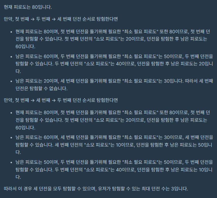 - 재귀 함수 호출을 통해 던전 입장 순서별로 탐험 가능한 최대 던전 수를 계산