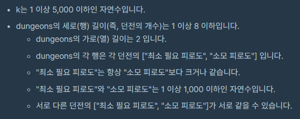 function solution(k, dungeons) {