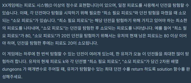 // hash를 순회하며 값이 0 && 현재 피로도가 필요 피로도 이상인 경우 던전 방문