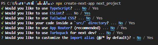 - 소스 디렉터리 분리 여부 (src 디렉터리 사용) : Next.js는 기본적으로 프로젝트 루트 디렉터리에 pages/, public/ 등의 디렉터리를 둡니다. 옵션을 yes로 설정하면 소스 디렉터리를 src/로 분리합니다.