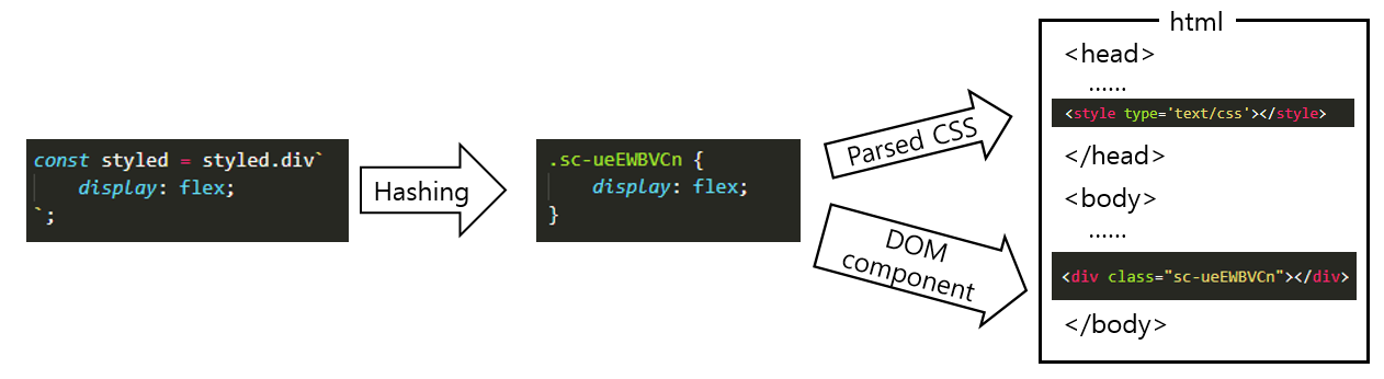 - CSS-in-JS에서는 각 컴포넌트를 hashing 하여 동적인 className("sc-cMWNzn")을 만듦.