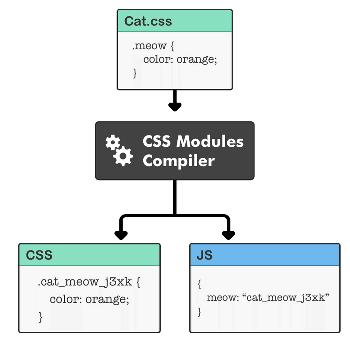 위 그림에서 볼 수 있듯이, CSS 모듈 컴파일 과정을 통해 [파일명]_[클래스명]_[랜덤 해시] 형태의 class name을 만들어 냅니다.