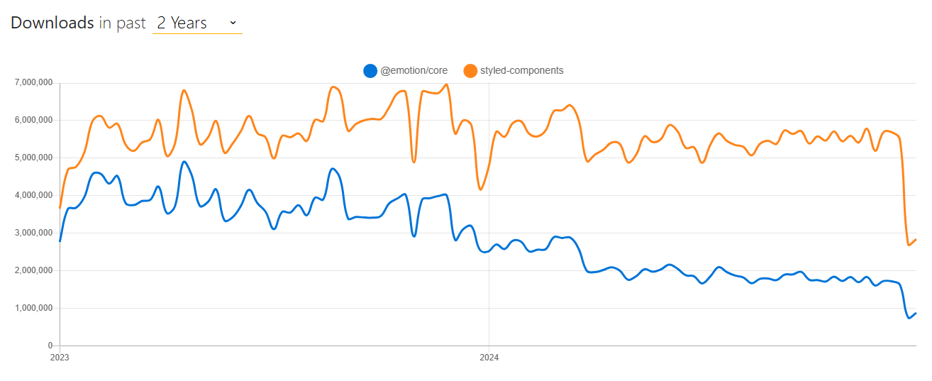 Emotion을 선택한 첫 번째 이유는 styled-components는 이전 미션과 프로젝트를 통해 많이 경험해 봤기 때문에 새로운 라이브러리를 경험해 보고 싶어서입니다. 트렌드를 따라가는 것도 좋지만 여러 라이브러리를 사용해 보면 왜 특정 라이브러리가 많이 사용되는지 비교해 볼 수 있을 것 같습니다😊