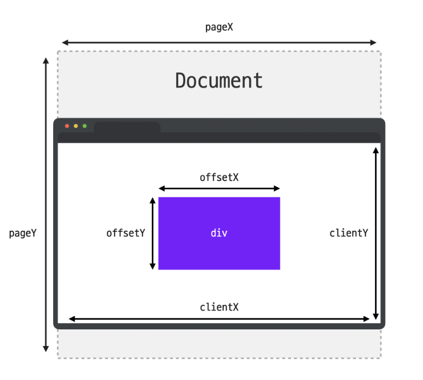 - offsetX, offsetY: 마우스가 화면의 어디에 있는지 좌표를 알려줍니다. (스크롤 위치와 무관하게 이벤트가 발생한 대상의 좌측 상단 모서리를 [0, 0]으로 계산합니다.)