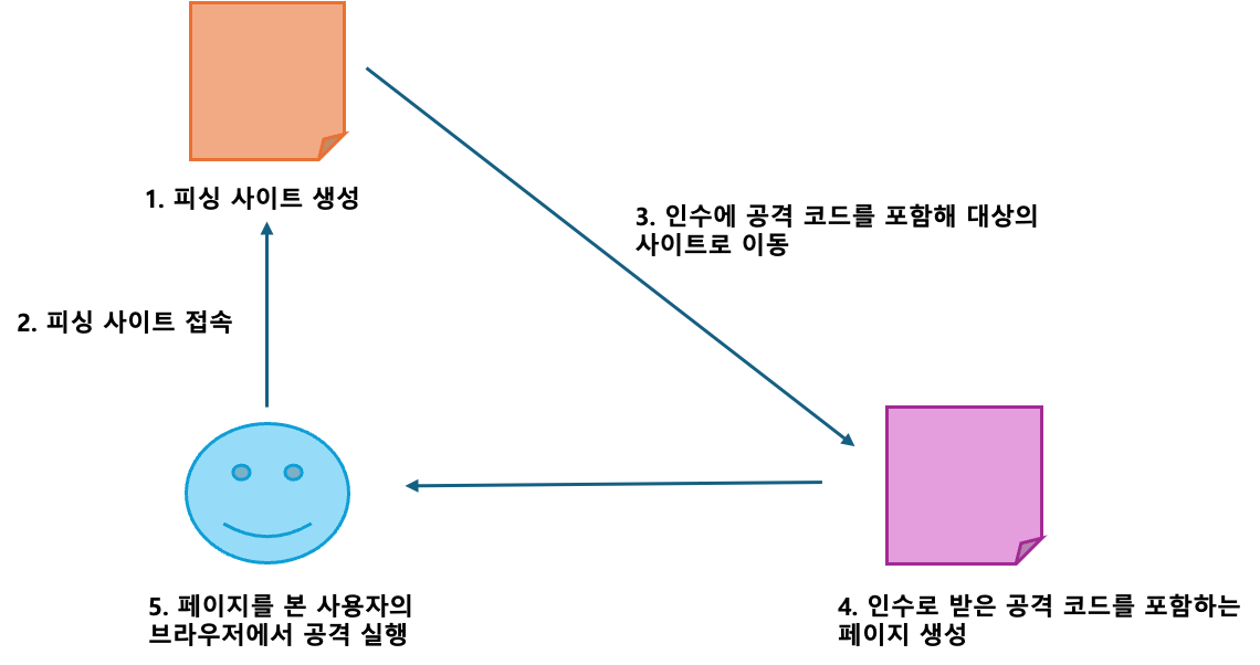악성 사용자가 악성 스크립트가 담긴 URL을 만들어 일반 사용자에게 전달하는 패턴입니다.