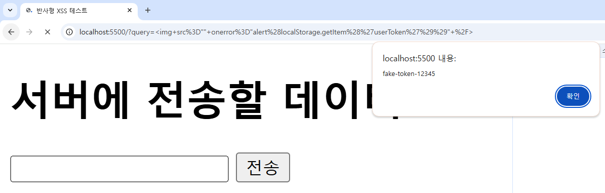 사용자의 로컬 스토리지에 저장된 토큰을 alert하는 스크립트를 포함한 URL을 만들었습니다.
