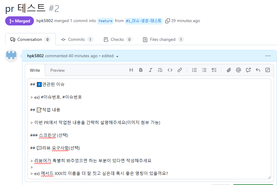 PR을 생성하니 pull_request_template.md에 작성해 둔 형식이 잘 적용되었네요👍