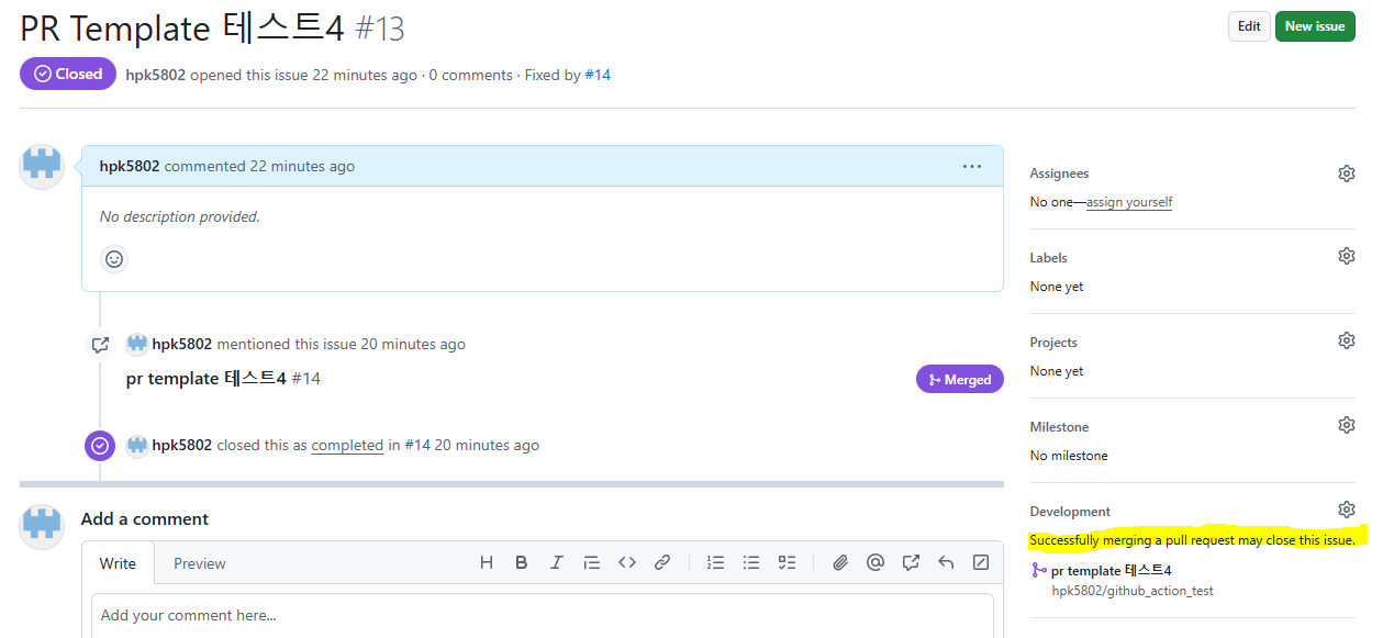 "Successfully merging a pull request may close this issue"라는 메시지와 함께 이슈가 Close 된 것을 확인했습니다🎉 🎉