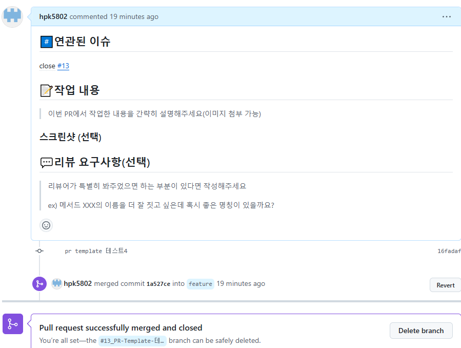 이제 PR Template에 적용 후 테스트 해보겠습니다✨