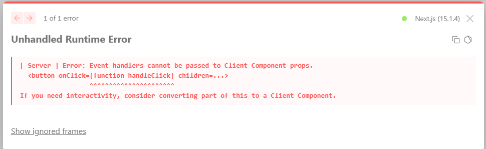 Next.js에서 button 요소에 onClick 이벤트 핸들러를 전달하려고 하는데 아래와 같은 에러가 발생했습니다.