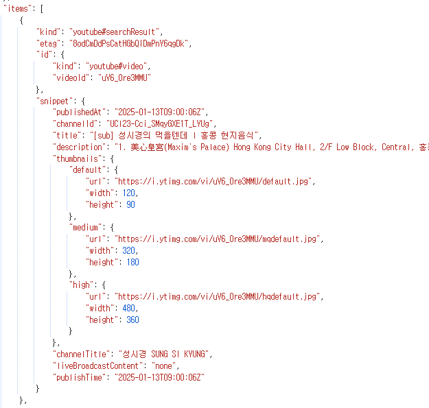 Youtube Data API 탐색기를 통해서 query에 "먹을텐데"를 검색하니 아래와 같은 결과가 나왔네요.