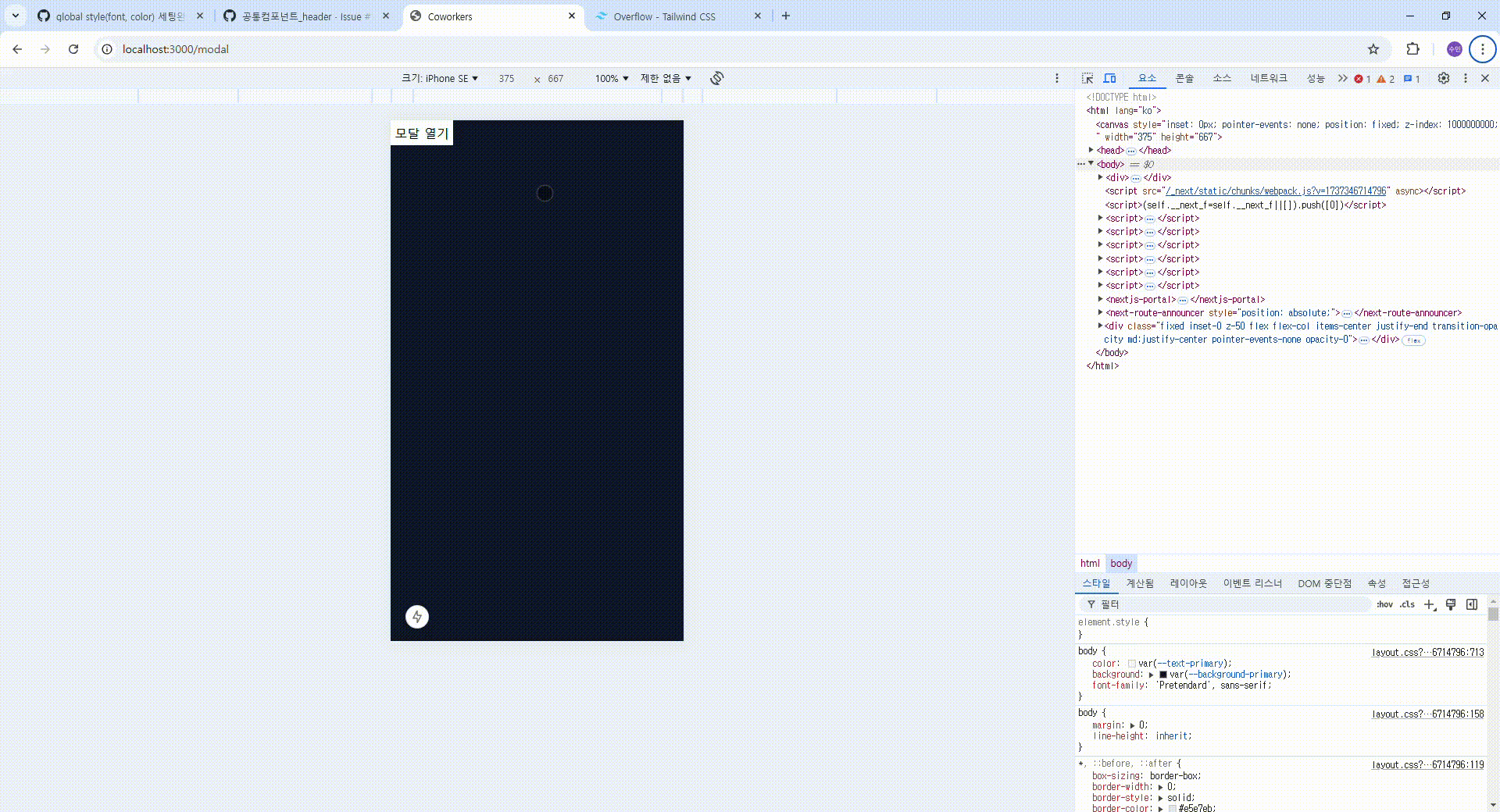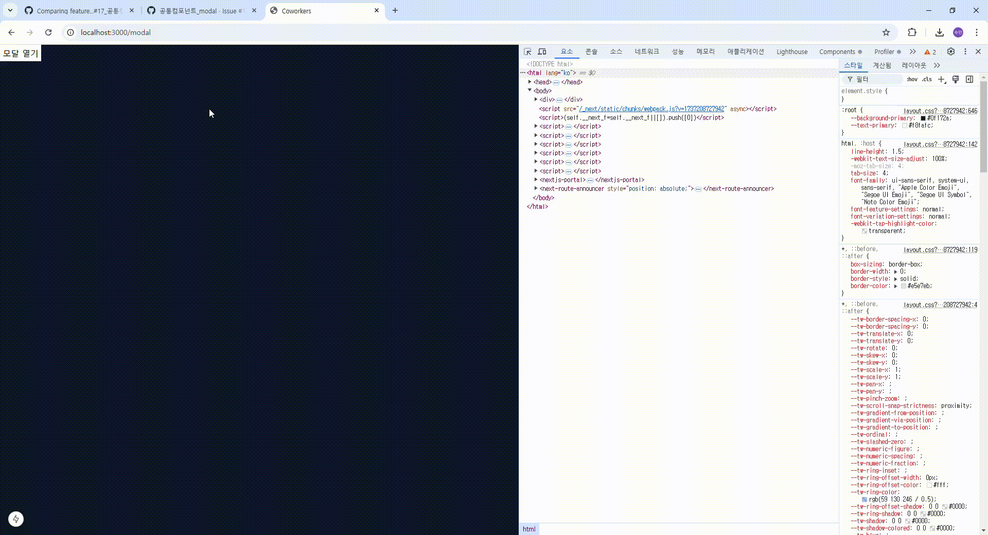 고급 프로젝트 Coworkers의 시작입니다. 저는 Modal 공통 컴포넌트를 맡게 되었습니다.