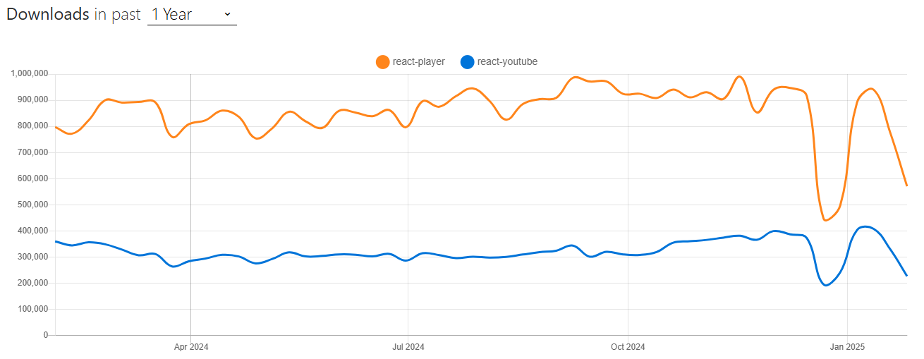 npm trends의 지난 1년간 다운로드 지표만 봐도 react-player가 react-youtube에 비해 압도적이네요. 뿐만 아니라 Next.js의 공식 문서에서도 react-player를 추천하는 third-party 플레이어 중 하나로 선정했어요.