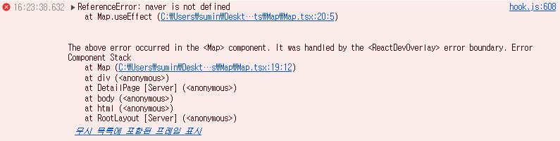 결과를 확인해보니 ReferenceError: naver is not defined 에러가 발생해 네이버 지도를 호출하지 못하고 있습니다.
