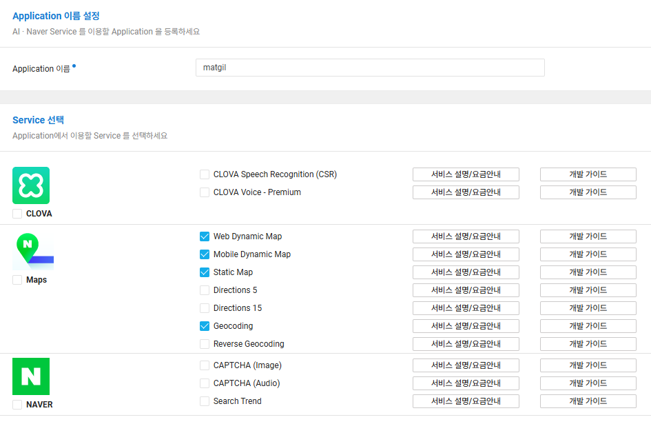 Application 이름은 서비스와 동일하게 matgil로 설정하겠습니다.