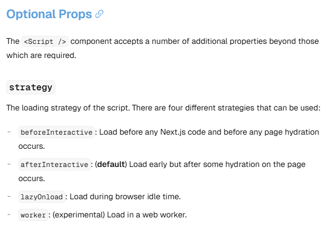 Next 공식 문서를 확인해 보니 Script 컴포넌트의 strategy 옵션은 스크립트 로딩 시점을 제어할 수 있는 4개의 옵션을 제공합니다. afterInteractive가 default로 설정되어 있고, 이 옵션은 hydration이 발생한 후 Script를 로드한다고 하네요.