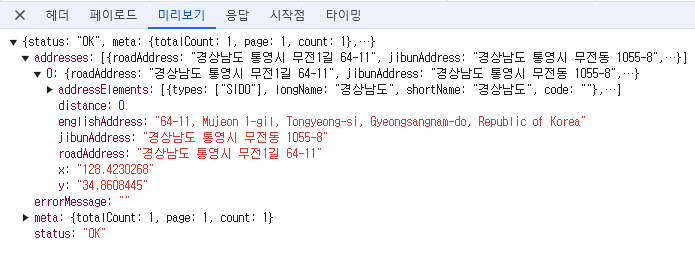 응답을 확인해봐도 API 요청이 성공해 주소를 response로 받고 있습니다.