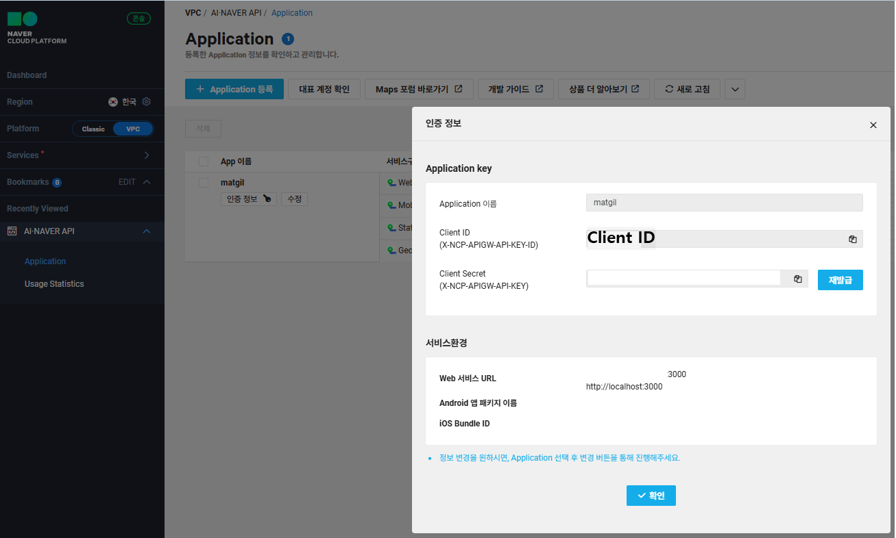 Application 등록을 완료했고, 인증 정보 버튼을 클릭해 보니 Client ID가 생겼습니다.