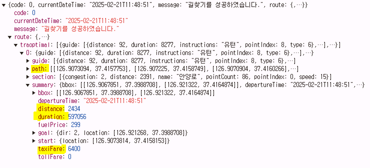 API 요청이 성공했습니다! 응답으로 받은 데이터에서 길찾기에 사용할 정보를 확인해 보겠습니다.