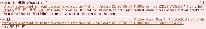CORS 에러(No 'Access-Control-Allow-Origin' header)가 발생했습니다. 에러 메시지에도 나와있듯이 로컬 주소인 3000번 포트에서 naveropenapi로 리소스를 요청했으니 당연한 결과입니다!