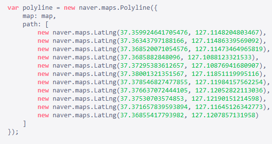 path가 경로를 구성하는 (경도,위도) 좌표 배열이네요. 경로는 Naver Map API의 polyline을 이용해 그리면 될 것 같습니다.