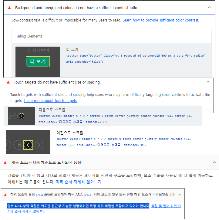 위 사진은 접근성 테스트에서 통과하지 못한 요소들입니다. 차례대로 하나씩 살펴보면서 수정해 보겠습니다.