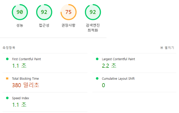 분명 접근성과 SEO를 고려하면서 작업했다고 생각했는데 결과가 92점이네요. 낮은 점수는 아니지만 완성도 높은 서비스를 만들기 위해 개선 작업을 해보겠습니다.