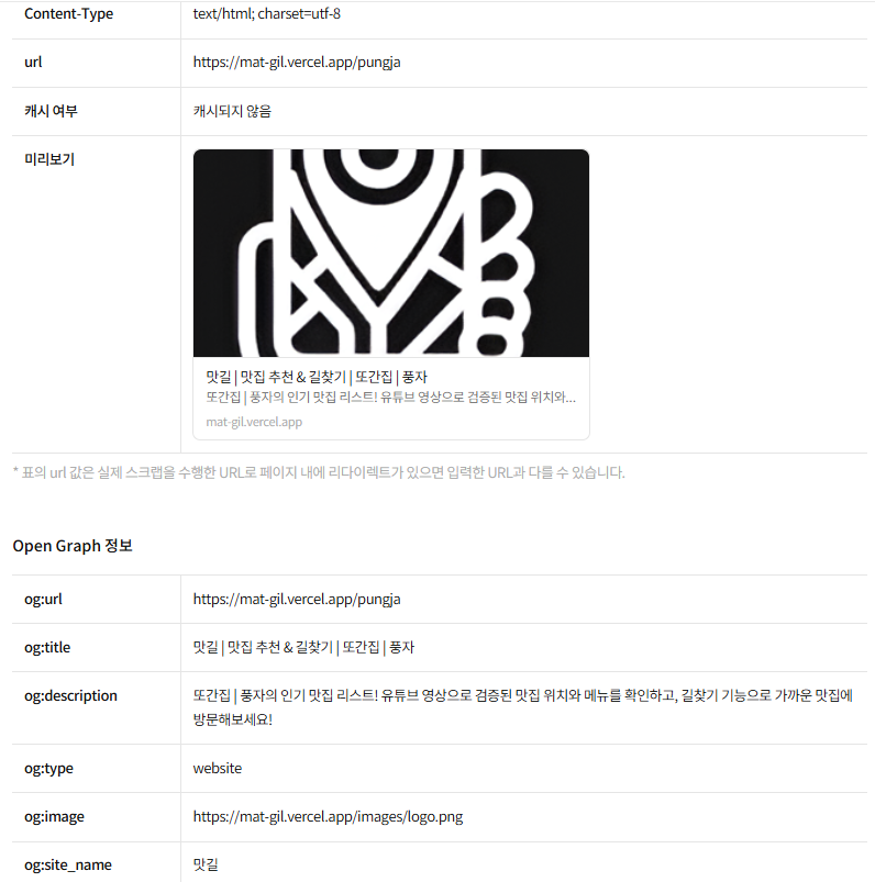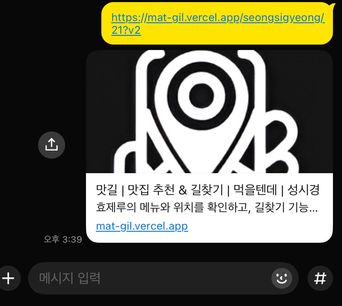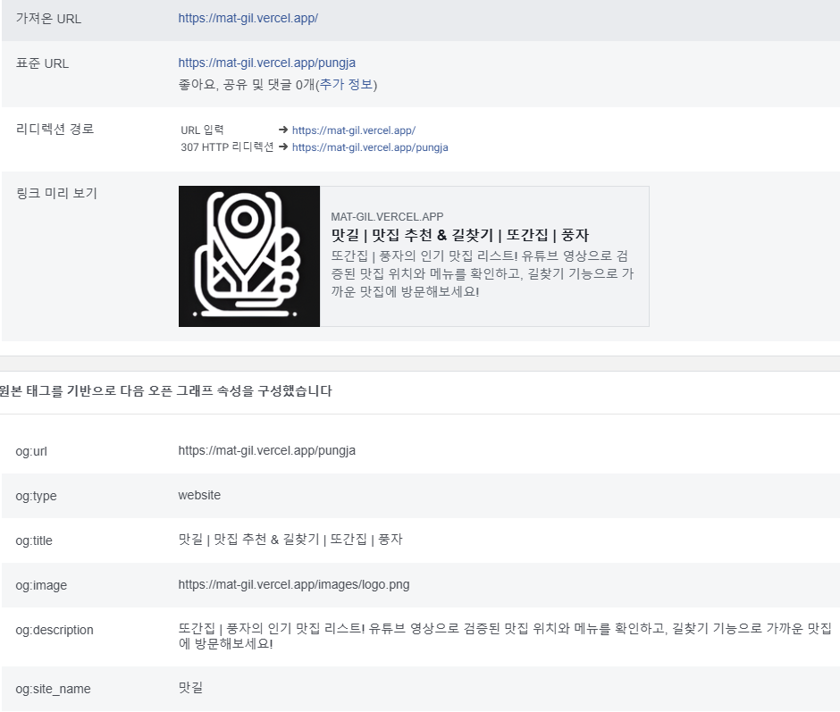 메타 데이터가 페이지에 따라서 동적으로 잘 생성 됩니다. 추가로 openGraph도 설정했으니, 공유 디버거와 실제 링크 공유를 통해 미리보기 화면도 확인해 보겠습니다.