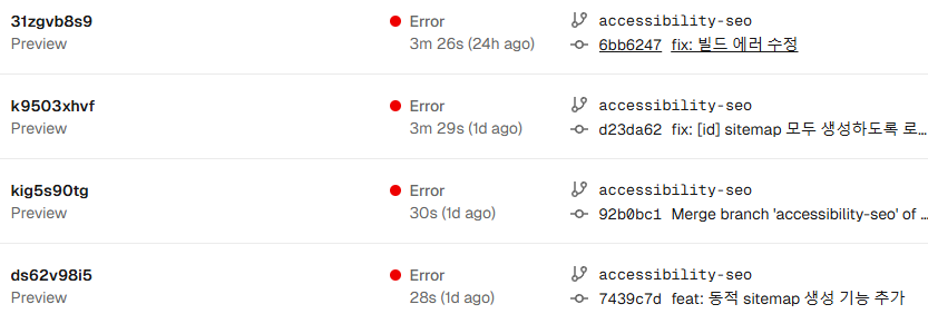 위의 동적인 사이트 맵을 생성하는 코드를 작성하기까지 여러번의 시행착오를 겪었습니다. 에러 메시지는 it took more than 60 seconds로 빌드하는데 시간이 오래 걸려서 발생하는 문제였습니다.