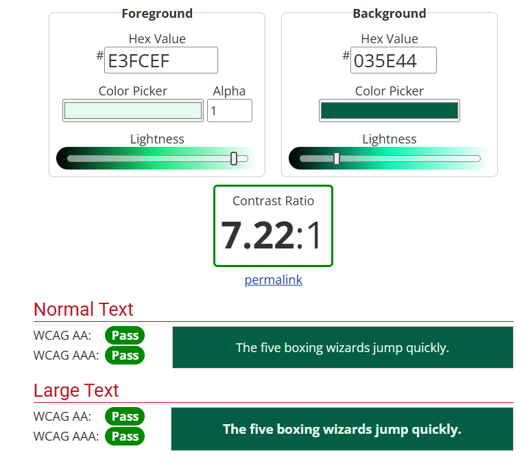 기존 버튼의 경우 배경색이 #059669, 텍스트가 #FFFFFF로 3.7:1입니다. 명암비 접근성 테스트 사이트를 이용해 접근성을 준수하도록 수정했습니다.