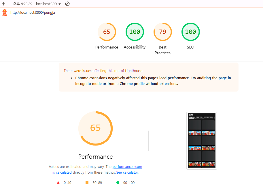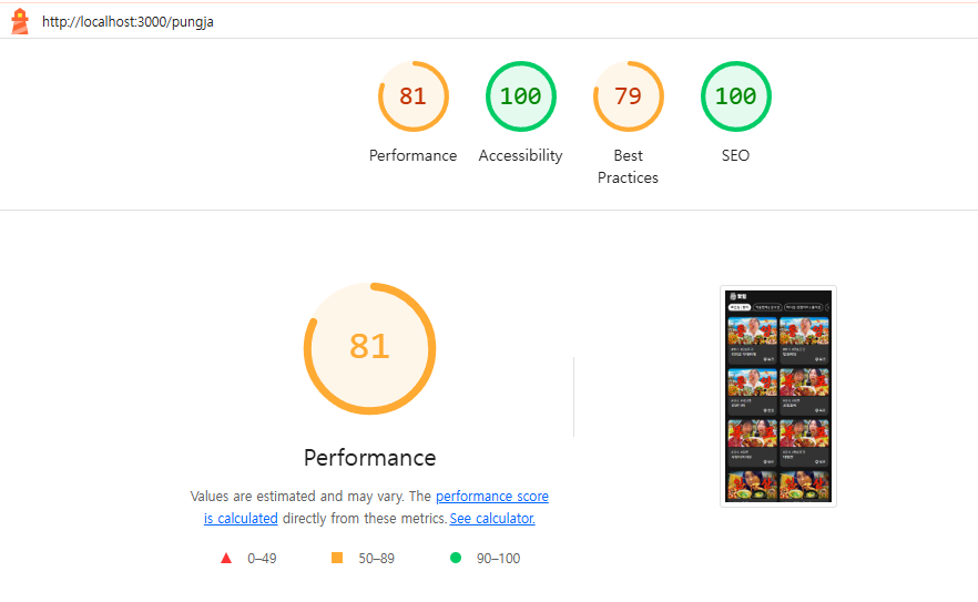 lighthouse의 성능 점수는 최적화 전 65점에서 최적화 후 81점으로 개선되었습니다.