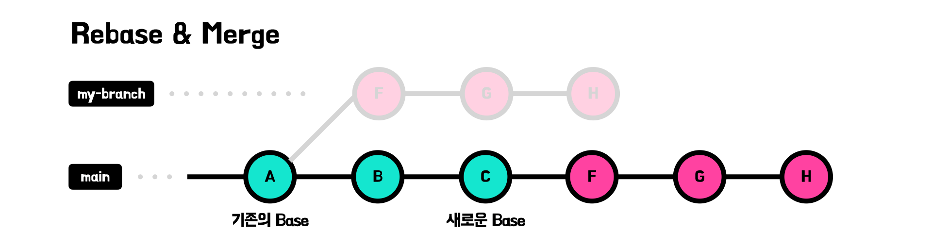 - 병합 커밋 없음: 병합 커밋을 생성하지 않고, 마치 하나의 브랜치에서 작업한 것처럼 보입니다.