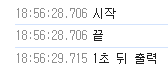 자바스크립트는 단일 스레드로 코드를 위에서 아래로 순차적으로 실행한다는 특징이 있습니다. 그럼 위 코드를 실행하면 '시작' - (1초 대기) - '1초 뒤 출력' - '끝' 순서로 출력될까요? 아래 결과를 보겠습니다.