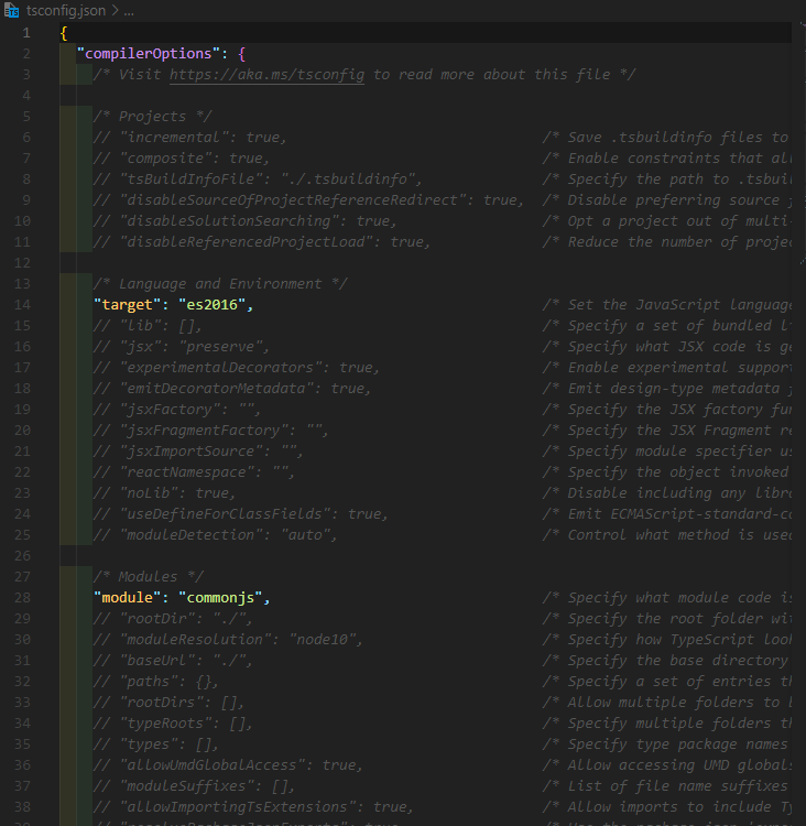 이 명령어를 실행하면 아래와 같은 기본 tsconfig.json 파일이 생성됩니다. 설정을 통해 타깃 ECMAScript 버전, 출력 디렉터리, 타입 검사 엄격 모드 등 다양한 옵션을 정의할 수 있습니다.
